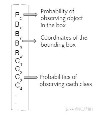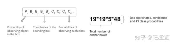 YOLO算法为每个定义的锚点框输出一个矩阵(如下所示)