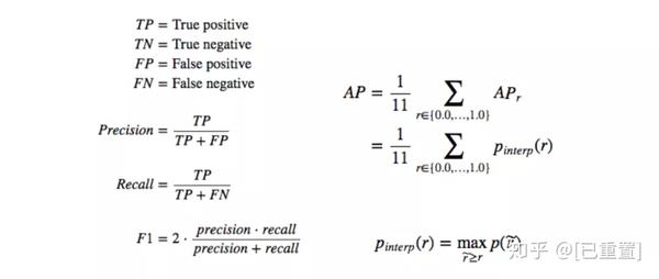 精确度衡量正确预测的百分比。召回是所有可能结果中真正确性的比例。这两个值是反向相关的,也取决于我们为模型设置的模型得分阈值(在我们的例子中,它是置信度得分)。他们的数学定义如下: