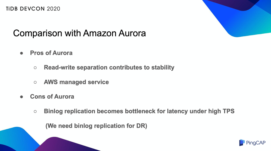 Aurora 的优点在于,它默认使用一个只读的 slave 节点,一个写入的 master 节点。主从间的同步延迟非常小,即使 slave 上发生慢查询,也不会影响 master 上的写入性能。恰当地使用这两个节点,可以有效确保稳定性,而且 Aurora 是 AWS 托管服务,管理成本较低。但是,当 Aurora 遇到许多写入请求时,binlog 同步会成为瓶颈。在提交过程中,Aurora 等待同步目标返回 ACK,因此当同步数量增加时,提交延迟也会增加。为了容灾,我们必须进行同步,所以这个问题日益严重。当我们进行 TiDB 的 POC 时,我们没有遇到这个问题,TiDB 可以轻松处理比 Aurora 多 3 倍的交易量。公平地说,我想强调一下 Aurora 是一个很好的数据库。但替换掉 Aurora,不仅是因为我们的 binlog 同步需求。