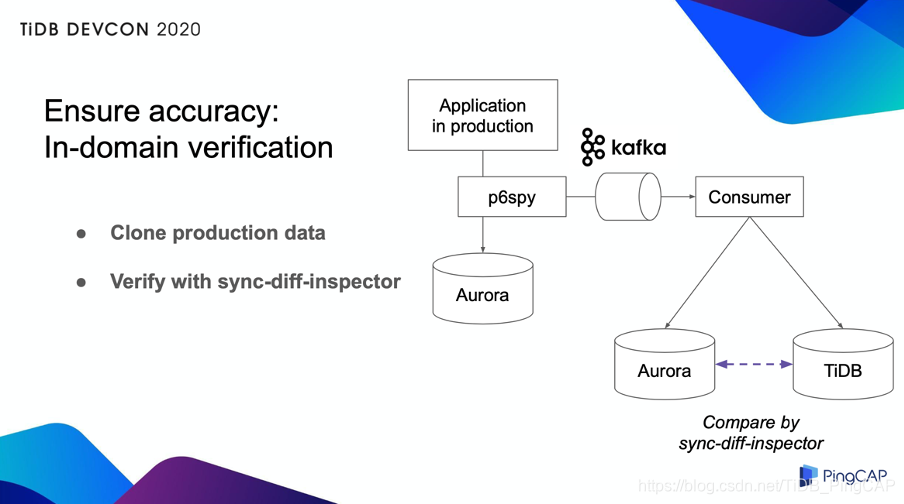 P6spy 抓取了通过 JDBC 连接发送的数据,将其发布到 Kafka 消息队列。用户应用程序在 Aurora 和 TiDB 上执行了通过 Kafka 消息发送的数据库操作。然后,我们使用 TiDB 提供的 sync-diff-inspector 比较了两组数据。结果我们确认两个数据库的数据完全相同。这种方法的优势在于,可以在不对生产数据库造成任何额外负担的情况下完成测试。