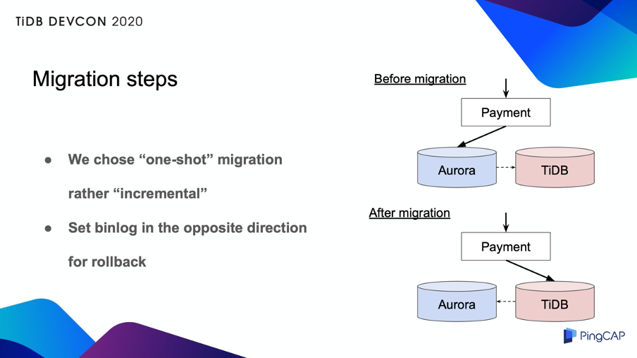 这种方法很简单,但一旦出现问题就会有风险,因为会影响到所有用户。因此,它必须能够立即回滚。我们在首次数据迁移中进行 binlog 同步,但在迁移过程中,我们将同步设置为相反的方向。 现在我们把 Aurora 作为备份,这样即使出现问题,也可以立即回滚。