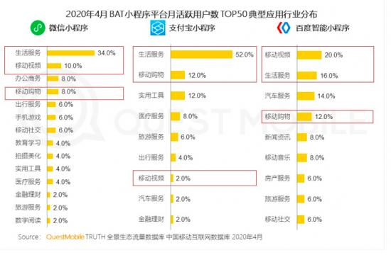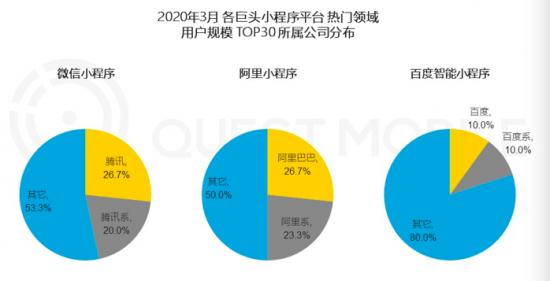 以2020年3月各巨头小程序平台用户规模TOP30所属公司分布为例,在微信小程序上,腾讯小程序占26.7%,腾讯系小程序占20%,其它占53.3%;而在百度智能小程序中,百度自家小程序占10%,百度系小程序占10%,其它占80%。