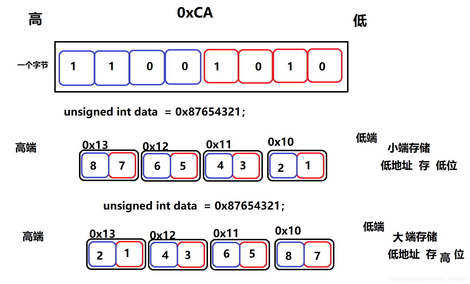 小端序(little-endian)低序字节存储在低地址 一般Intel、AMD,ARM采用这种