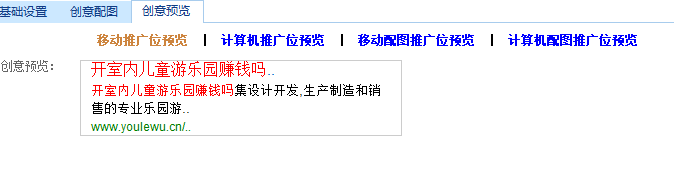 创意就是在我们在百度搜索时,搜到了竞价推广页面,而推广页面就是由关键词,标题,描述,图片,访问URL以及显示URL组成的。而这一个整体就叫创意。只要创意写的好,那我们的点击量就会非常大,一条好的创意也是我们竞价账户优化的关键。
