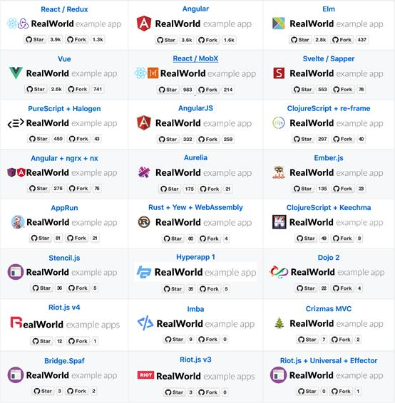 撰写此文时,Realworld存储库中有24种conduit实现As,它们之间的从属地位并不重要,唯一的判定标准是看它是否出现在RealWorld repo page上。