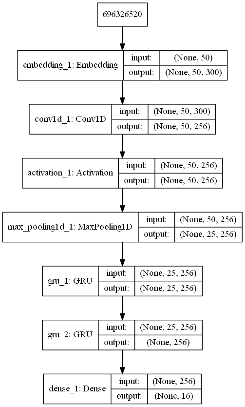 其中,嵌入层是50*300的二维矩阵,卷积层的滤波器为3*300的二维矩阵,向下移动的步长为1,卷积层之后使用Relu激活函数,最大池化层的池化窗口大小设置为2,GRU层的神经元个数设置为256,使用Dropout防止模型过拟合,其Dropout值设置为0.5,输出层的神经元个数设置为16,并且使用softmax作为输出层的激活函数。使用交叉熵损失函数计算该模型的损失,使用Adam优化器最小化损失函数,模型训练的批次大小设置为600,迭代次数设置为25。