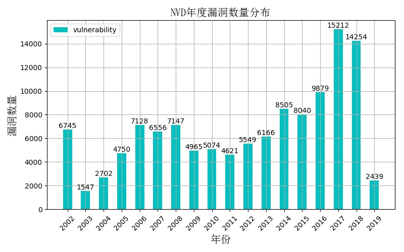 在过去的十几年中,漏洞数量增长迅速,对NVD从2002年到2019年5月份的数据统计显示,漏洞总数高达121279条,其中包括未知漏洞类型就多达38868条。年度新增漏洞数量分布如下图所示: