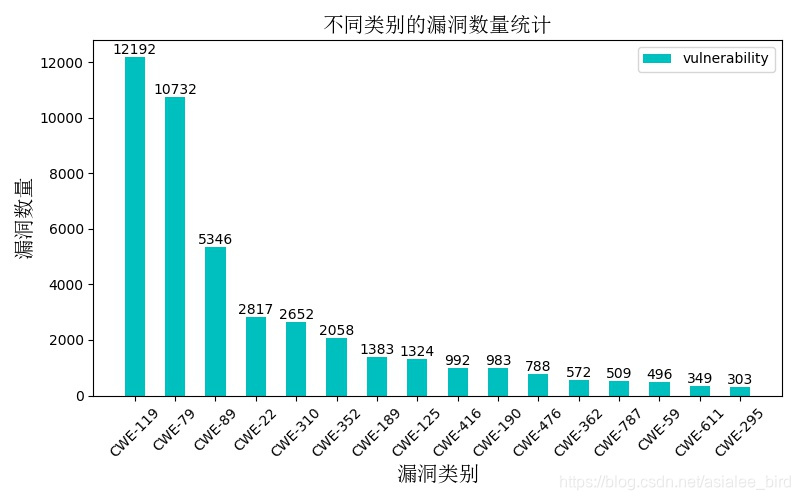 本实验选取从2002年到2019年5月份的43496条NVD漏洞数据进行实验研究,其中包含16个主要漏洞类型。不同漏洞类型统计数量分布如下图所示: