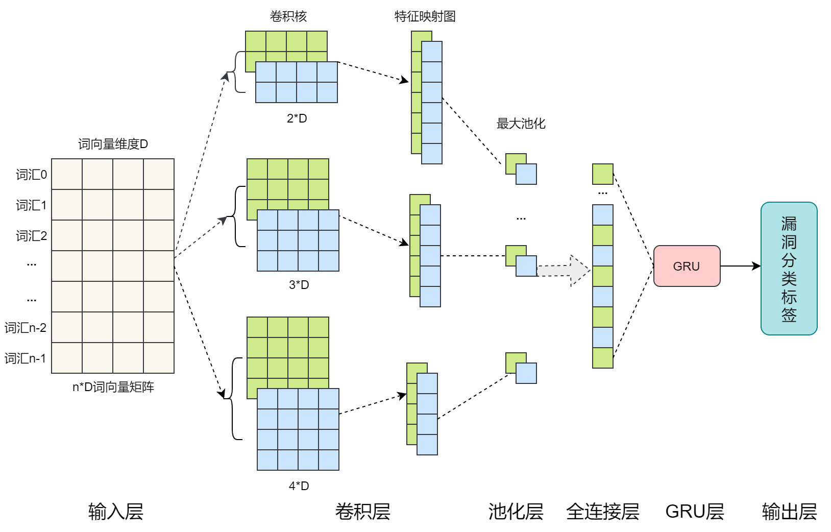 每条漏洞文本的表示方法有(1)将每条漏洞文本中所有词的向量相加求和然后取平均来表示句向量,即实验将每条漏洞文本使用300维的向量表示,作为模型的输入。(2)将每条漏洞文本中每个词的向量乘以该词的权重(加权词向量),然后相加求和取平均来表示句向量,作为模型的输入。其中,权重可以根据TF-IDF和信息增益等方法求得。(3)将每条漏洞文本表示成一个句子矩阵作为模型的输入。句子中每个词是由m维词向量组成的,也就是说输入矩阵大小为n*m,其中n为句子长度。