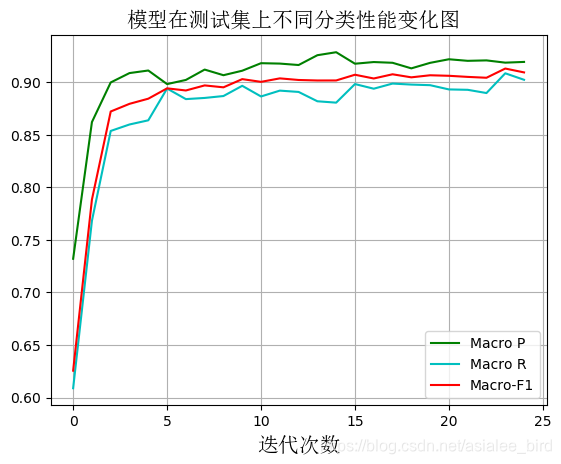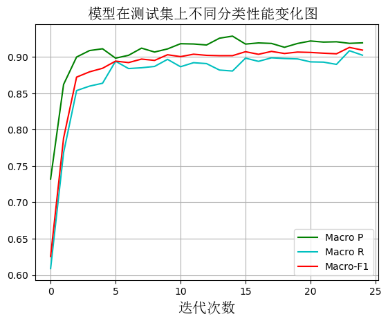 3、随着模型训练迭代次数的增加,模型在测试集上的宏精确率、宏召回率和宏F1的变化图