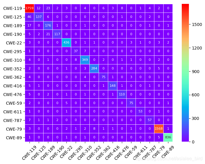 图中的行代表漏洞类别,每行的数字之和代表该漏洞类别的漏洞数目,对角线上的数字表示漏洞分类正确的个数,其余数字表示漏洞类别分类错误的个数。
