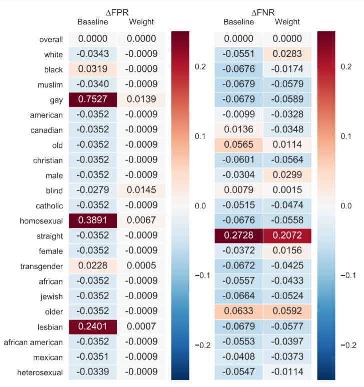 文本分类问题是自然语言处理中的一个基础问题,旨在根据语义预测一句话的标签。常见的文本分类任务包括情感检测、意图分析等。最近,学术界发现文本分类数据集常常包含对某些群体的歧视,这是因为这些数据集反映了人类社会中普遍存在的偏见。机器学习在这些有歧视的数据集中训练时,也会学习到这些歧视的模式,从而产生歧视性的预测结果。比如,模型可能会仅仅因为句子中的“女人”一词就把“我是一个女人”判断为侮辱性语句。这一研究探究了文本分类中歧视问题的形式化定义,并提出了一种基于样本加权的无需额外数据的模型去歧视方法。实验结果表明他们的方法可以有效缓解模型预测过程中对弱势群体的歧视问题。