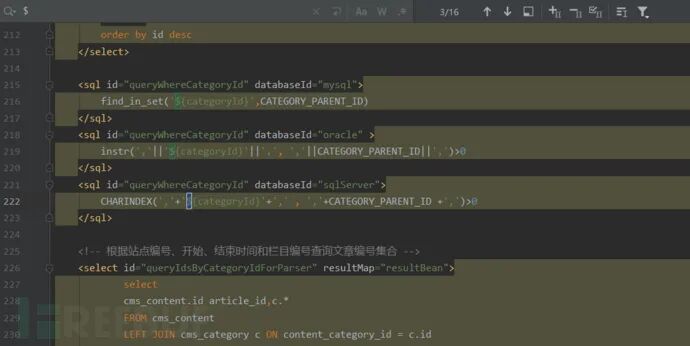 根据文件名带Dao的xml为我们需要的,以IContentDao.xml为例,双击打开,ctrl +F 搜索$,查找到16个前三个为数据库选择,跳过,