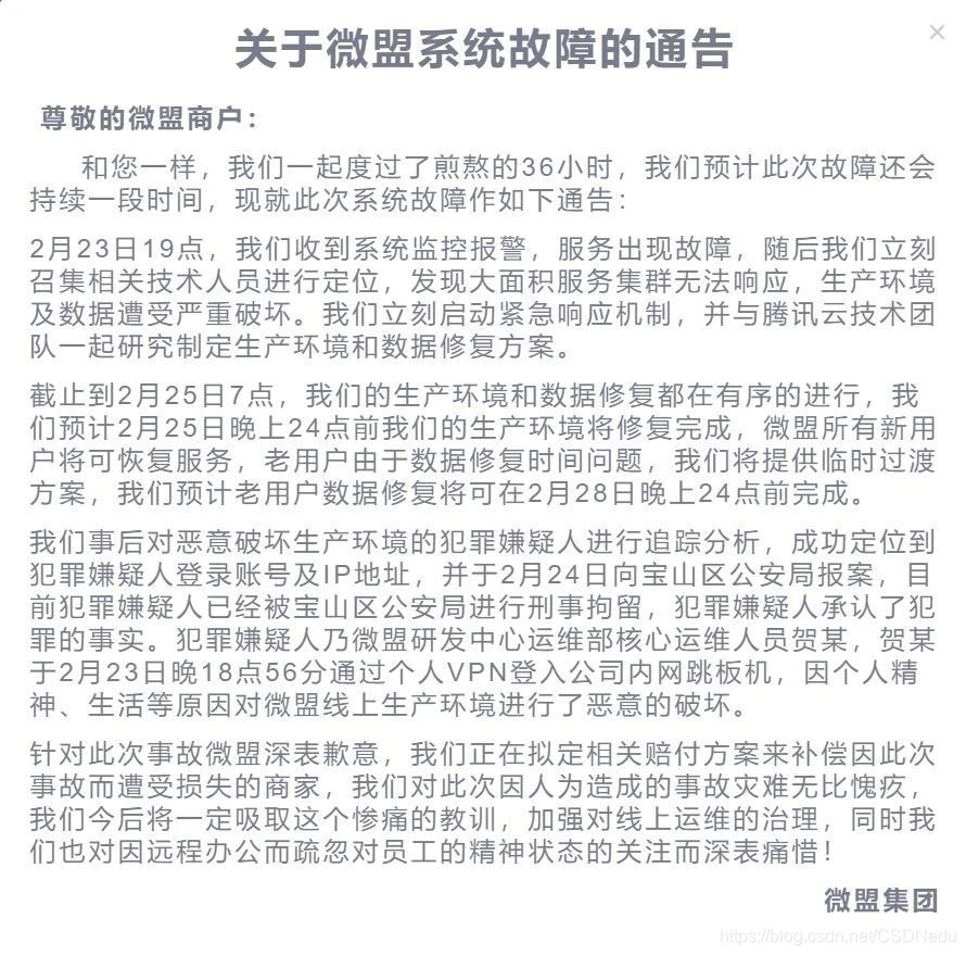 犯罪嫌疑人是微盟研发中心运维部核心运维人员贺某,于2月23日晚18点56分通过个人VPN登入公司内网跳板机,因个人精神、生活等原因对微盟线上生产环境进行了恶意破坏。