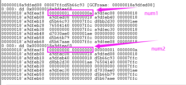 从LOCALS中可以看到,num1和num2的线程栈上存放的内容分别是0x0000000a00000001和 0x0000000000000000, 不过这值也挺奇怪的,一个是1一个是0。。。我们用 dd 命令把地址转储出来。