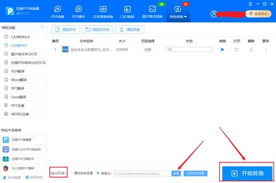 导入完成之后,在输出目录中点击“浏览,”选择转换完成后PDF文档的保存位置,最后点击页面右下角的“开始转换”就可以了。