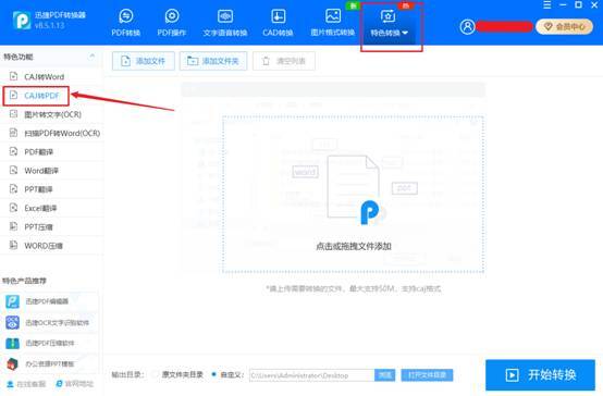 打开一款CAJ或者PDF的转换软件,小编在试用过很多软件之后,决定给大家推荐这款“迅捷PDF转换器,”打开软件,在页面上方找到特色转换,然后在左侧的特色功能中找到“CAJ转PDF。”