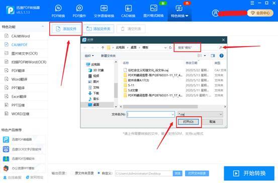 导入一份或者多份需要进行转换的CAJ文档,点击添加文件,在弹出的打开窗口中进行选择,如果大家一时之间找不到电脑中的CAJ文档,可以通过打开窗口中的搜素框,输入关键词进行搜索,最后点击打开进行导入。