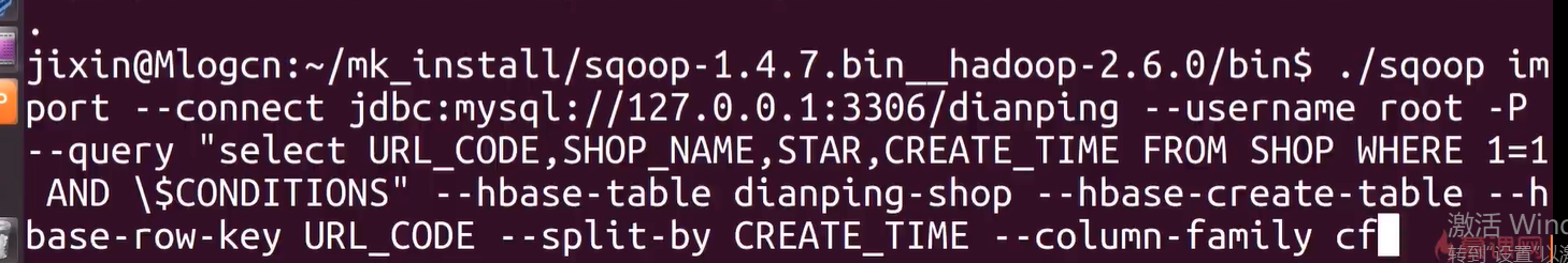 ./sqoop import --connect jdbc:mysql://127.0.0.1/dianping --username root -P --query "select URL_CODE,SHOP_NAME,STAR,CREATE_TIME from SHOP WHERE 1=1 and \$CONDITIONS" --hbase-table dianping --hbase-create-table --hbase-row-key URL_CODE --split-by CREATE_TIME --column-family cf