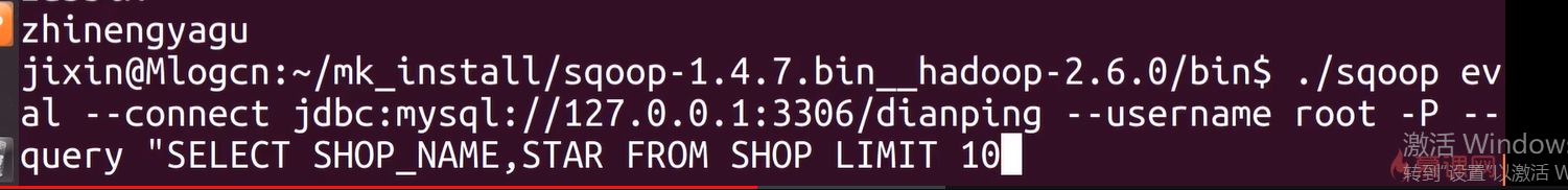 ./sqoop eval --connect jdbc:mysql://127.0.0.1/dianping --username root --password 123456 --query "select SHOP_NAME,STAR from SHOP limit 10"