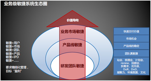 我们会围绕三个方面去开展讨论,把它叫做业务级的敏捷生态圈。我们的很多团队都在做敏捷开发,这个理念是基于团队的,也就是中间的白色的小圈,这个范围是我们的产品研发团队(包括测试),跳出这个圈站高一级,产品线这一层级理解。考虑到产品线的稳定性,就是产品线与团队的拉通。产品线敏捷之后,当打造的产品不是市场想要的,问题就来了。产品线里有多款产品,如何选择产品?优先级如何排序呢?这时候就要考虑市场在哪儿?业务在哪儿?我们的客户在哪儿?跳出来看市场。