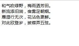 和气吹绿野,梅雨洒芳田。<br />新流添旧涧,宿雾足朝烟。<br />雁湿行无次,花沾色更鲜。<br />对此欣登岁,披襟弄五弦。
