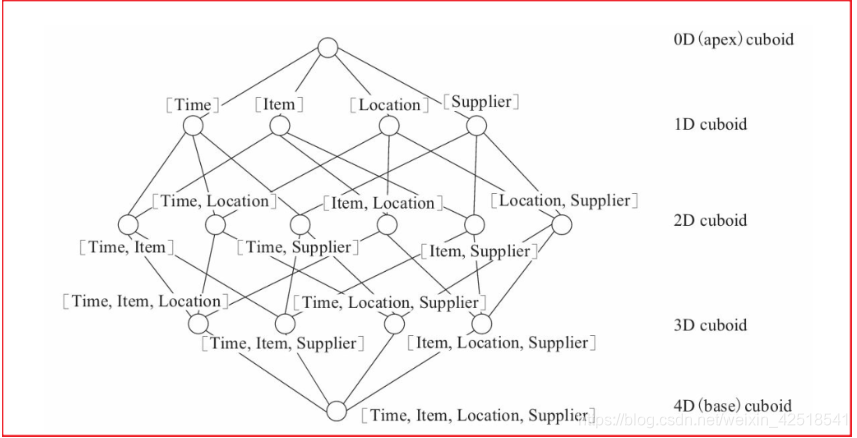 - 每一种 dimession 的组合称之为cuboid(立方形)。某一有 n 个 dimession 的 cube 会有 2^n个 cuboid