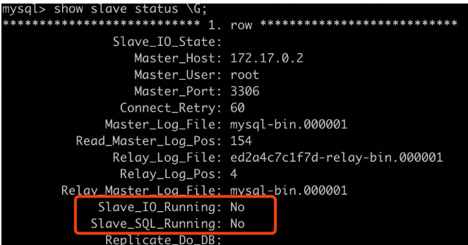 可以看到两个属性slave_io_running和slave_sql_running都是no,也就是关闭状态。