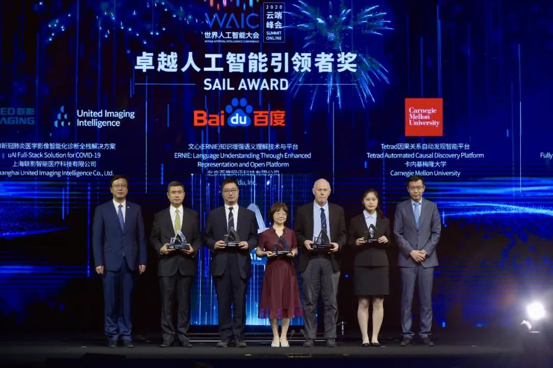7月9日,2020世界人工智能大会(WAIC)正式开幕,大会颁布最高奖项SAIL奖(Super AI Leader,卓越人工智能引领者),百度文心(ERNIE)知识增强语义理解技术与平台获奖,百度技术委员会主席吴华上台领奖。