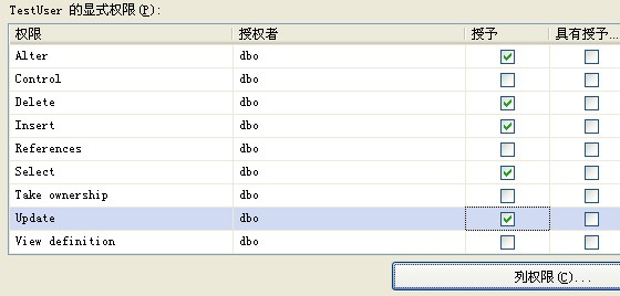6. 在上面点击【确认】后,我们就可以下面的列表中找到对应的权限,如果你还想细化到列的权限的话,右下角还有一个【列权限】的按钮可以进行设置,点击【确认】按钮就完成了这些权限的设置了