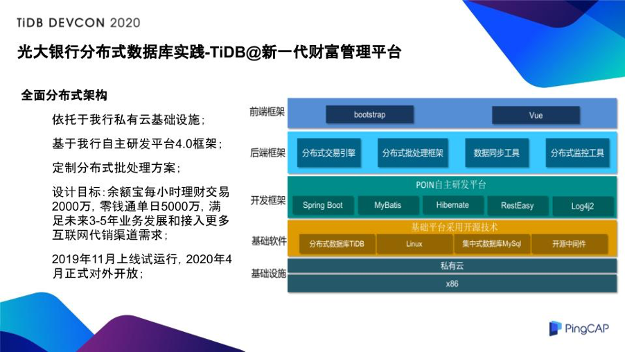 并不是说有了分布式数据库,整个就万事大吉,一键我们分布式了,其实整个过程还是很复杂的,我们设计了全面的分布式架构来确保我们的新一代理财系统能够支撑光大银行理财子公司的财富管理的业务,依托光大银行私有云基础设施,基于我行自主研发平台 4.0 开发框架,并且定制了分布式批处理的方案。我们的设计目标是余额宝每小时理财交易 2000 万,零钱通单日 5000 万,同时还要满足未来三到五年的业务发展和接入更多互联网的渠道,其实他是一个面向未来的系统,这个系统去年 11 月上线运行,今年 4 月正式对外开放。