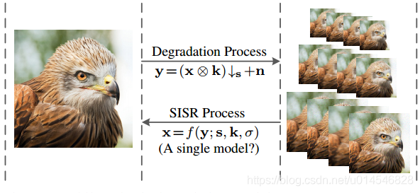 Figure 1. While a single degradation model (i.e., Eq. (1)) can result in various LR images for an HR image, with different blur kernels, scale factors and noise, the study of learning a single deep model to invert all such LR images to HR image is still lacking.