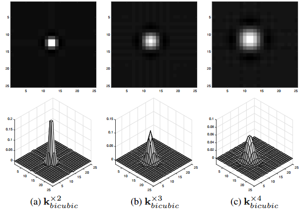 Fig. 2 shows the approximated bicubic kernels for scale factors 2, 3 and 4. It should be noted that since the downsamlping operation selects the upper-left pixel for each distinct s × s patch, the bicubic kernels for scale factors 2, 3 and 4 have a center shift of 0.5, 1 and 1.5 pixels to the upper-left direction, respectively.