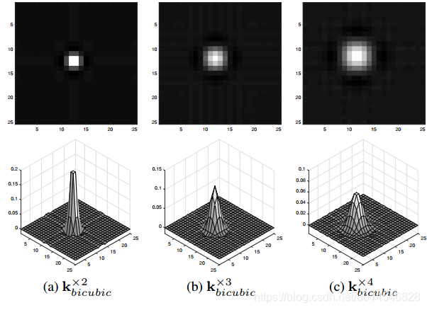 图2显示了比例因子2、3和4的近似双三次核。需要注意的是,由于 downsamlping 操作为每个不同的  patch 选择左上角像素,因此比例因子2、3和4的双三次核分别向左上角偏移 0.5、1和1.5像素。