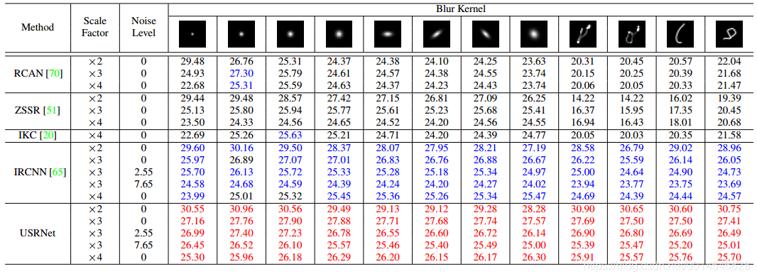 Table 1. Average PSNR(dB) results of different methods for different combinations of scale factors, blur kernels and noise levels. The best two results are highlighted in red and blue colors, respectively.