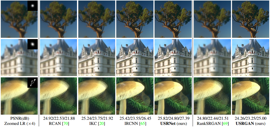 4) USRNet 在不同退化设置的 LR 图像上表现良好,显示出巨大的实际应用潜力。