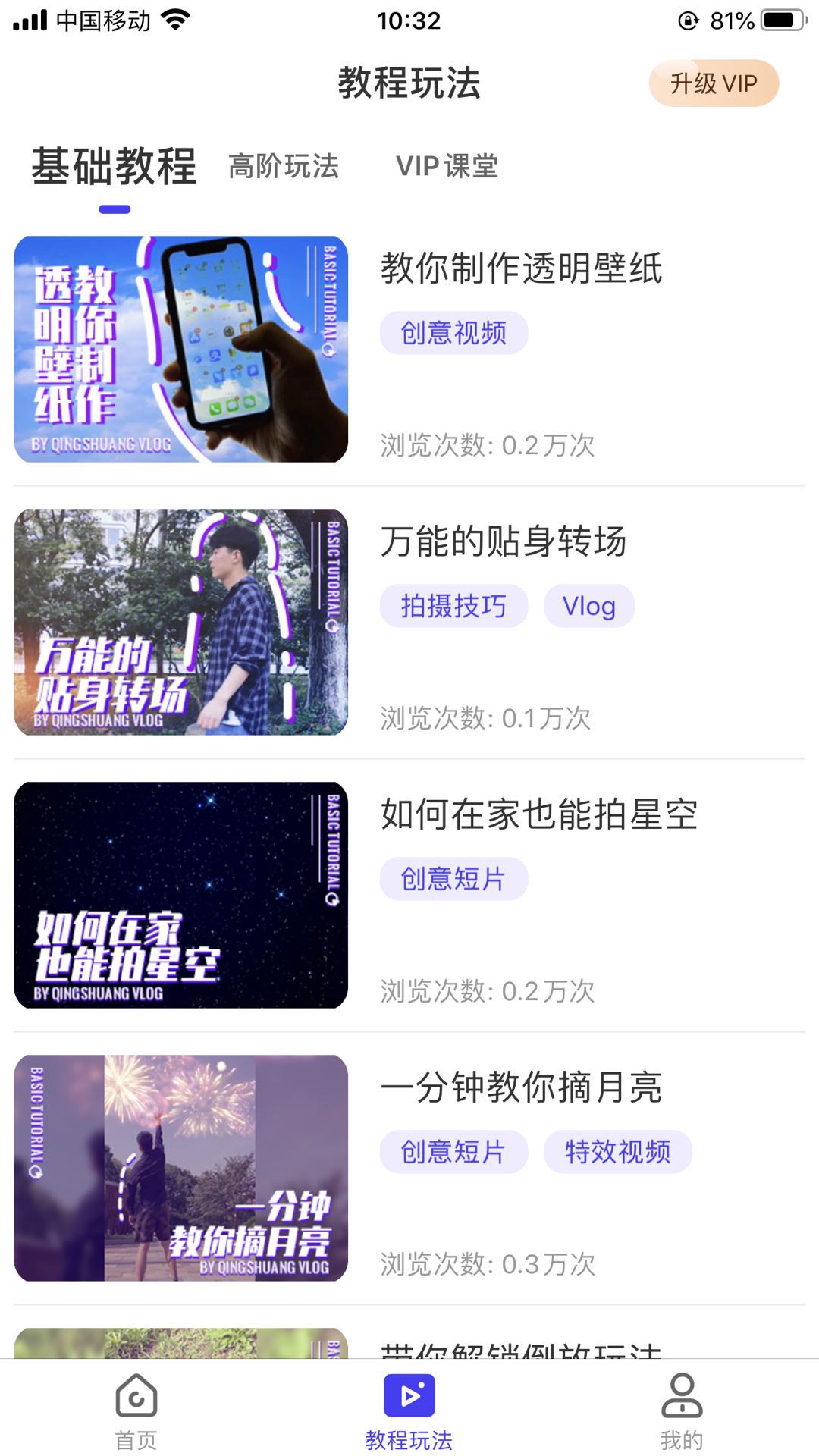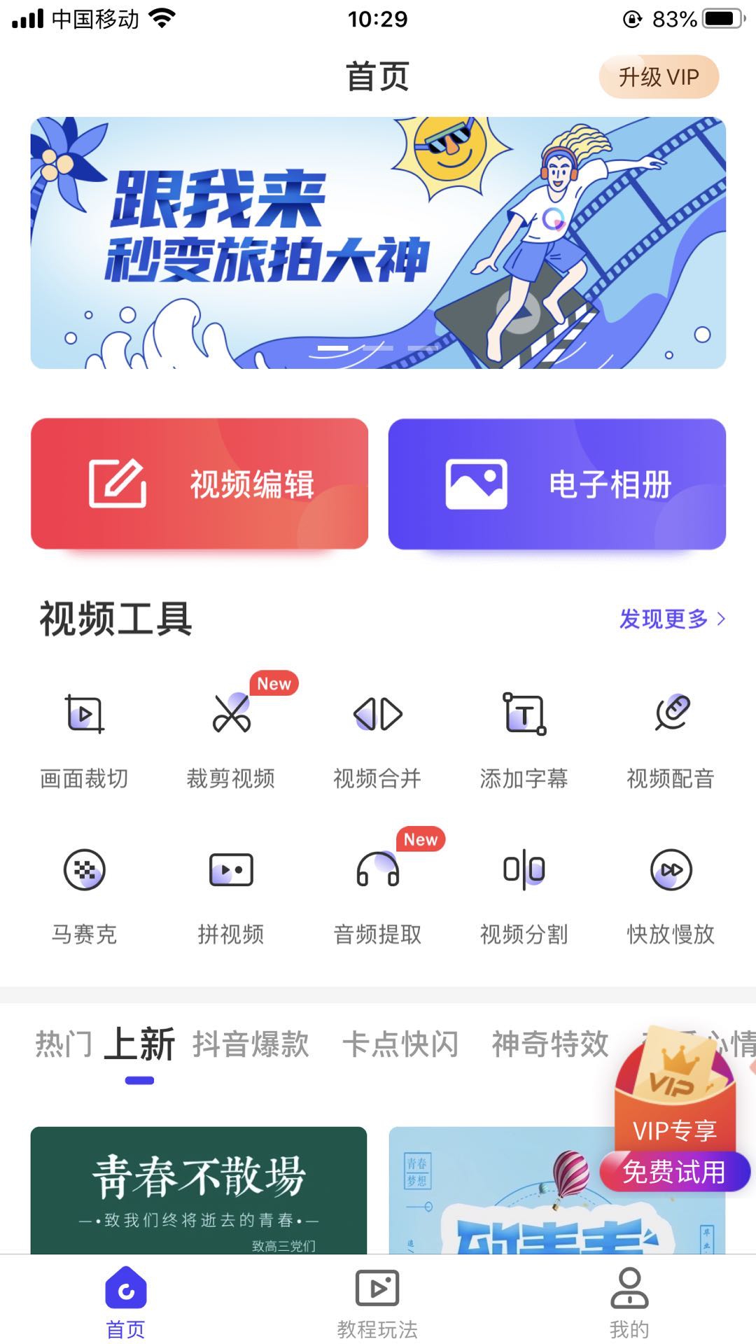 四、轻松学会软件使用,在软件下方有一个教程玩法,里面有很多不同好玩的教程,可以让你快速学会,变成视频编辑大神,不用担心自己不会使用,即使你是一个视频小白,跟着教程也能做出酷炫视频。