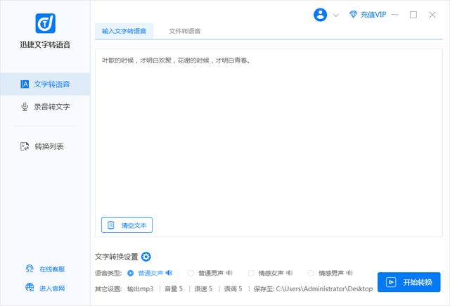 在刚开始尝试使用这款软件的时候,可以先尝试输入一些优美的句子,如小李子比较喜欢的这一句:“叶散的时候,才明白欢聚,花谢的时候,才明白青春。”输入后,点击【开始转换】按钮便可。点击后,小伙伴们便可以看到文字已经成功转换成语音啦。