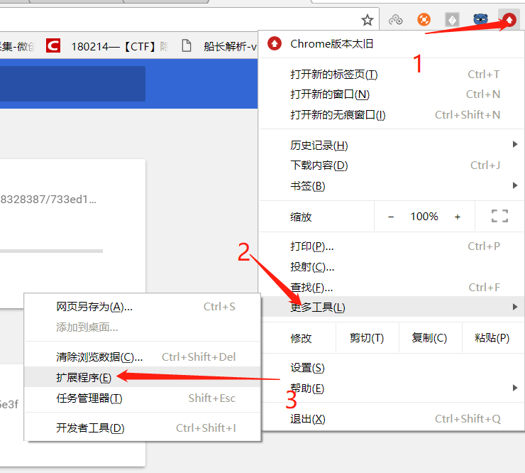 1、 我们将压缩包进行解压(友情提示:大家不要直接解压本目录下面,需要指定一个目录解压,因为这个压缩包里面没有包裹一层,希望不要被坑,我是解压到conflux-portal-chrome-0.2.2目录下面了),下面打开大家的Google Chrome ,按照下图的三部打开扩展程序面板,如图: