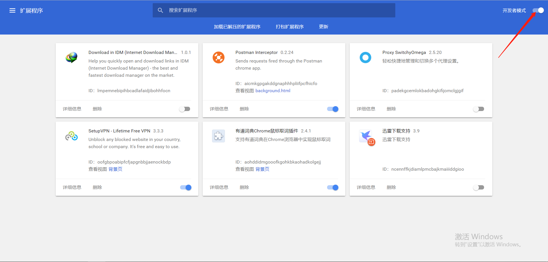 2、 大家的扩展程序面板可能不是开发者模式,因此需要打开开发者模式,点击开发这模式旁边的按钮即可。