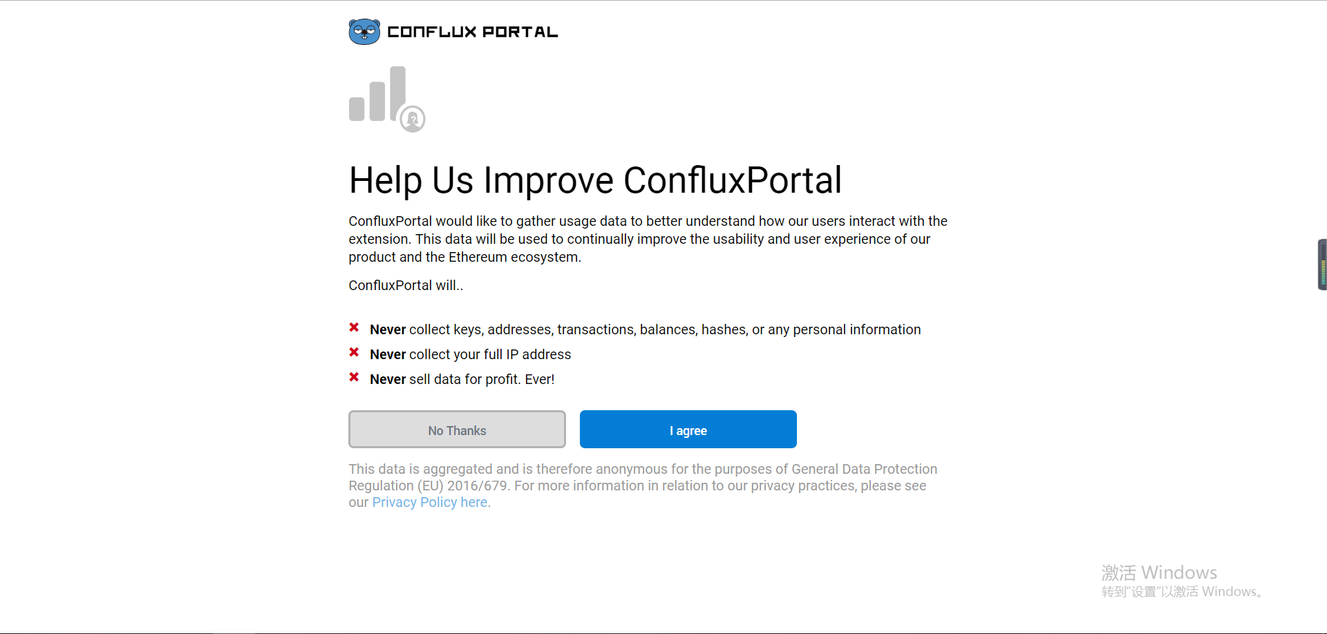 2、上图中有两个选择,我们可以导入之前已经创建的钱包,也可以创建一个新的钱包。相信阅读本教程的小伙伴大部分都没有自己的钱包呢,我将会先创建钱包,在进行导入钱包,方式进行讲解,有钱包的小伙伴可以直接跳到导入钱包教程。创建钱包会跳入下面页面,没啥好犹豫的直接 ‘I agree’ 同意就好了。如图: