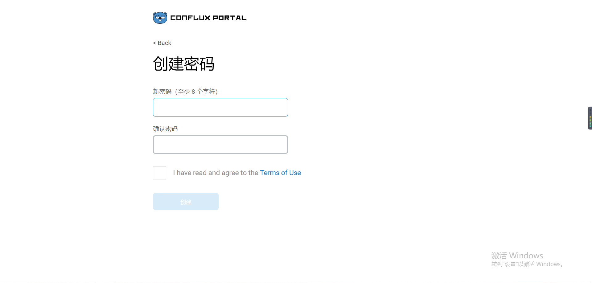 4、 点击同意后会进入到下面页面,这里我们要输入密码两次,并且勾选同意协议按钮,一定要记住你的密码,不然丢失后,可是找不回来的。如图: