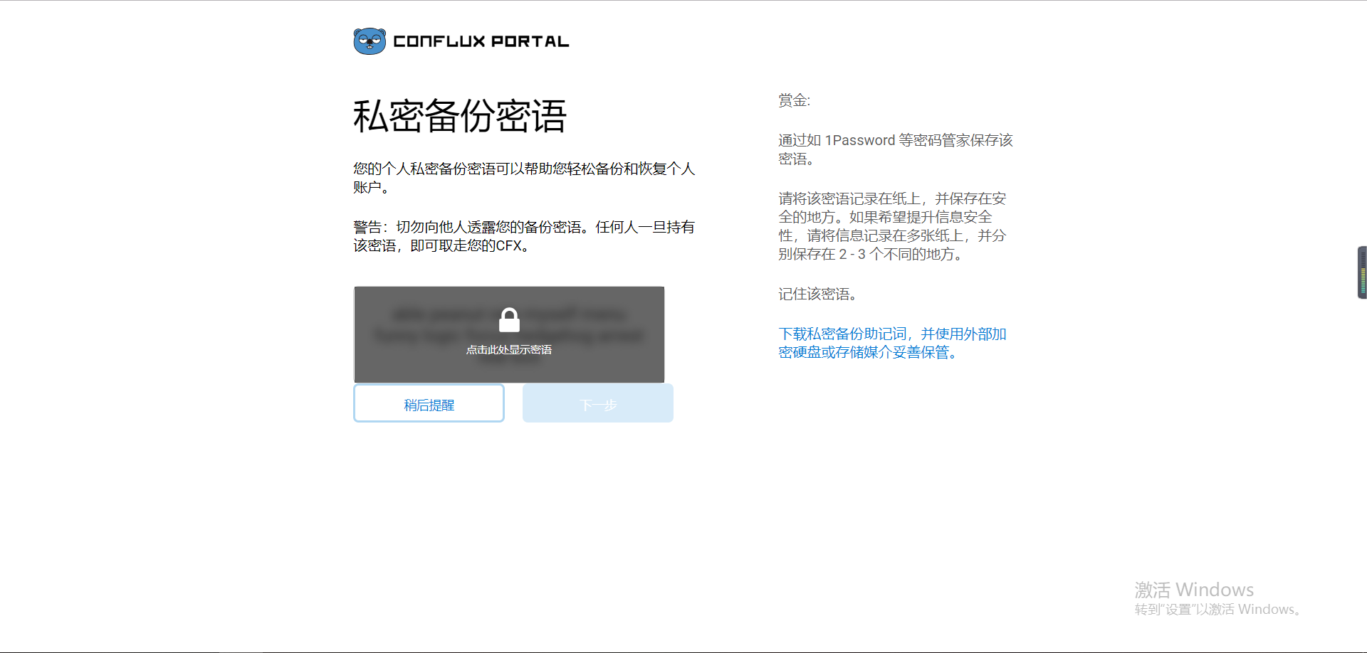 6、 点击显示密语,记下来就好了,本教程使用的是随便创建的一个钱包因此公布出来助记词也没关系,大家的助记词千万别泄露了,不然你的钱包要小心了。