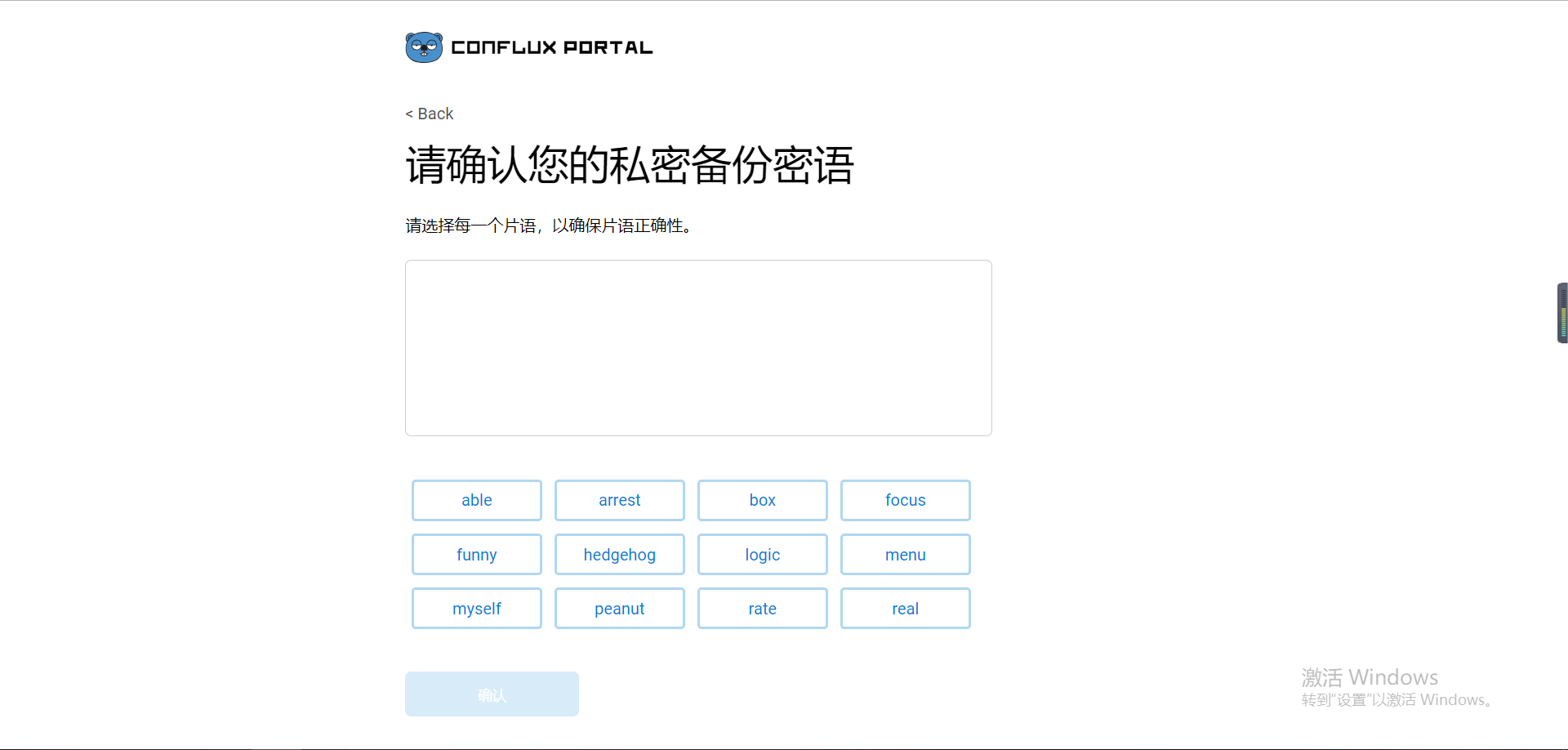 7、 下面还有一步就是将助记词完整的填入确认页面,这一步真的是多余的,我本人很不喜欢,但是没办法,谁叫我们是使用者呢,填写吧。如图: