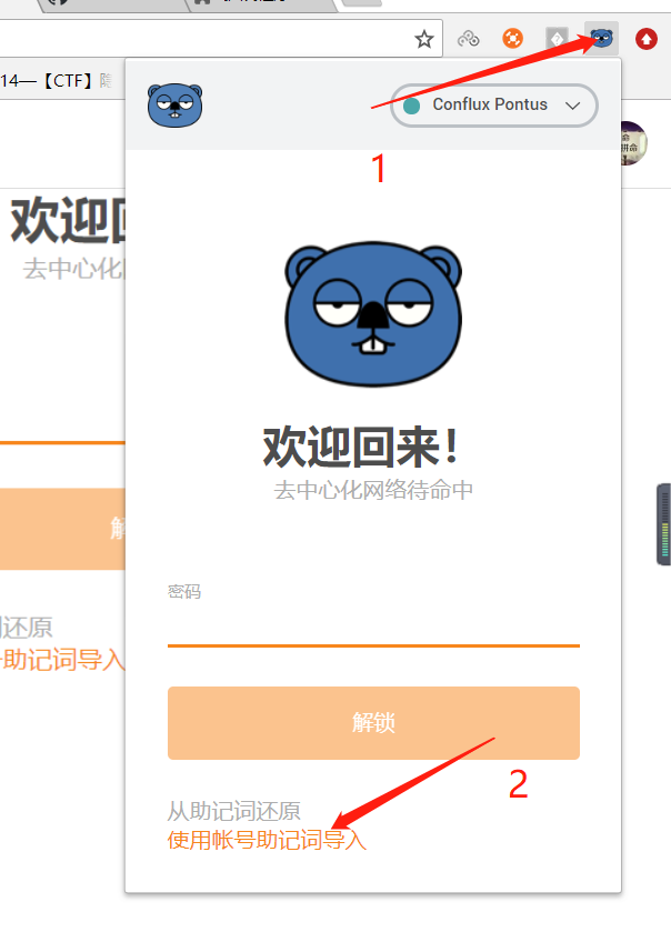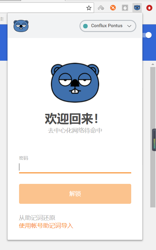 我们可以将上面输入的密码输入进去然后解锁。如果密码忘记,那么将使用助记词找回你的钱包,在重新设置密码。也就是重复上面第四步。