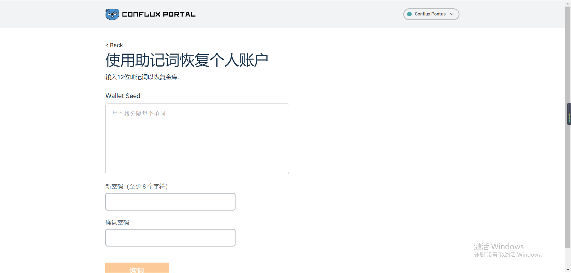 3、我们使用上面的助记词,填入,密码重新输入也可以,也可以使用我们之前的密码,都可以的。填写完成后我们进行点击恢复,就发现进入到上面创建成功后进入的页面了。