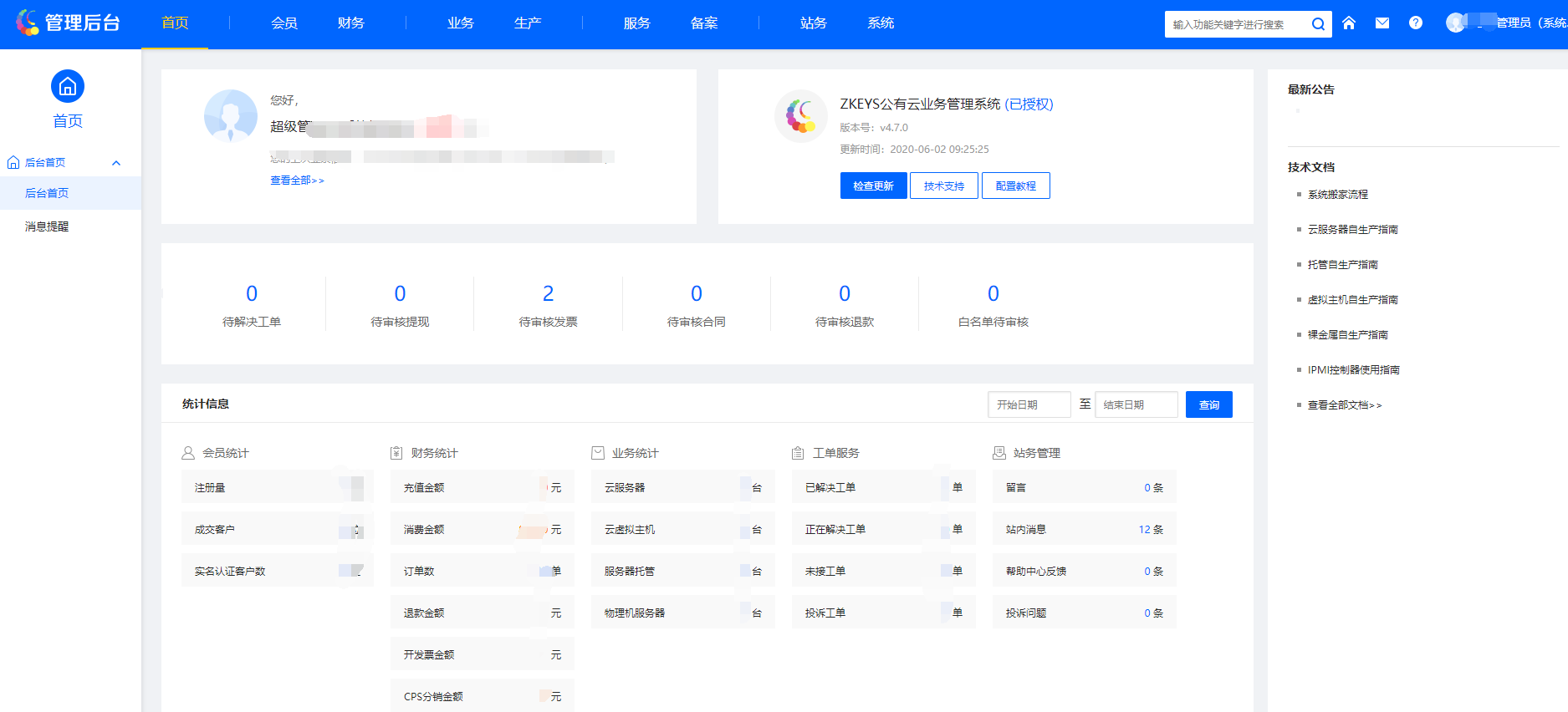 ZKEY公有云管理系统可以管理包括计算、网络、存储等资源,功能模块涵盖云服务器、虚拟主机、托管等业务等,支持一键安装Linux及Windows等多种环境,然后系统集成了完善的财务系统、工单系统、备案系统、会员系统、业务系统等板块,有本地资源自生产和API的功能。