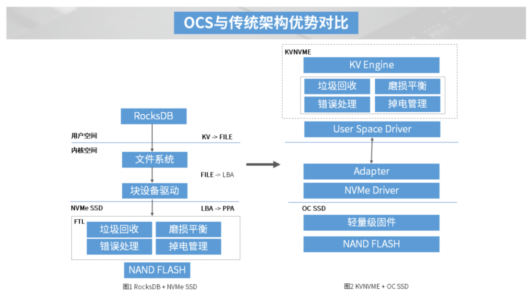 在百度的Open-Channel KV实现中,SSD不再以块设备形式存在,而是以KV服务的形式呈现给上层业务,KV逻辑向上层提供KV接口。KV接口接收到的键值对将被一步写到物理介质NAND的某个地址上并在内存中记录映射关系,无需经过文件系统/虚拟内存/块设备的层层转换,读取时同理。数据的传输获得的是软件层面最短的路径,因而延迟大幅度缩短。