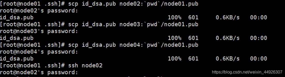 cd .ssh)scp id_dsa.pub node02:`pwd`/node01.pub scp id_dsa.pub node03:`pwd`/node01.pub scp id_dsa.pub node04:`pwd`/node01.pub